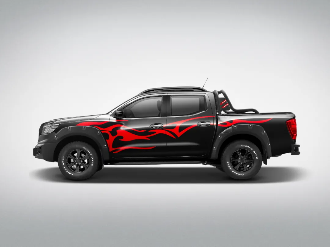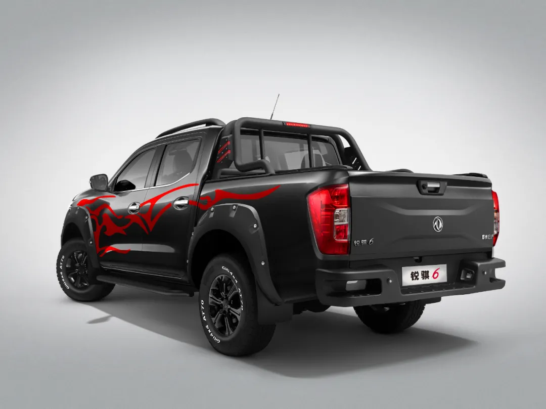 外观方面,锐骐6越野版采用炫酷黑色车身搭配燃动火焰式拉花,彰显车型野性魅力。哑光式动感格栅,凌厉硬朗,英气十足。16寸乌金越野轮辋,全地形越野轮胎,再加上带铆钉的宽体轮眉,强烈越野气息扑面而来。车顶行李架、越野防滚架(带高位刹车灯),越野侧踏板、内绳钩、发动机护板等诸多越野配置应有尽有,强化了新车的实用性与便利性。