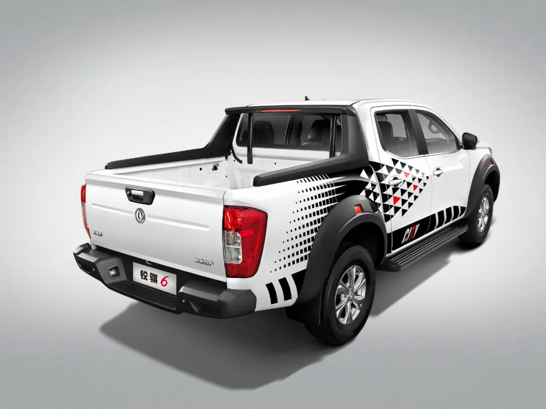 锐骐6都市版外观时尚精致,前脸采用钢琴黑烤漆前格栅设计,配合棱角分明的鹰眼式大灯、LED日间行车灯带,极具时尚动感。车身硬朗修长,长宽高分别为5360mm*1920mm*1810mm,轴距达3150mm,配合城市几何彩贴及新款轮眉,全车更具都市时尚气息。值得一提的是,该款车贴采用车规级材质,保证长期使用的耐久性,且官方原厂出品,年审无忧。此外,采用流线型设计的侧风翼高位刹车灯,有效降低车辆风阻系数及风噪,增加车辆安全系数及美观性。